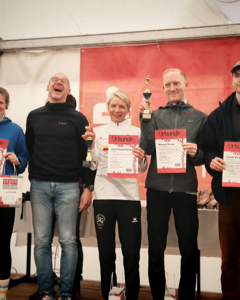 Kurz nach dem Zieleinlauf analysierte Jana ihren Lauf. „Es war eine Schlammschlacht. Meine Klamotten werde ich wahrscheinlich nie wieder richtig sauber bekommen, die Schuhe auch nicht. Es war windig, wechselte von Rücken- zu Gegenwind. Große Pfützen, denen ich anfangs noch versucht habe auszuweichen, später war es dann egal, einfach mitten durch. Es war anstrengend, anstrengender als der 15er. Ich bin total zufrieden, happy über die Zeit und natürlich über den Gesamtsieg. Die Serie hat wieder Spaß gemacht. Ich bin froh, dass ich nicht krank geworden bin, musste aber die ganze Zeit gegen eine Erkältung ankämpfen. Diesen Kampf habe ich gewonnen.“